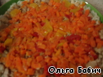 Перцы чистим от пленки, режем мелко, немного оставляя для украшения, морковь режем мелко, тоже немного оставляем для украшения, укладываем сверху грудки, поливаем соусом.