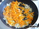 Лук нашинковать, морковь натереть на крупной терке. Лук обжарить на растительном масле до прозрачности, к нему добавить морковь и тушить, помешивая 5-7 минут.