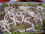 Теперь собираем нашу «лазанью». В форму, смазанную маслом, кладем примерно третью часть листьев, сверху кладем половину ореховой начинки, поливаем соусом.
