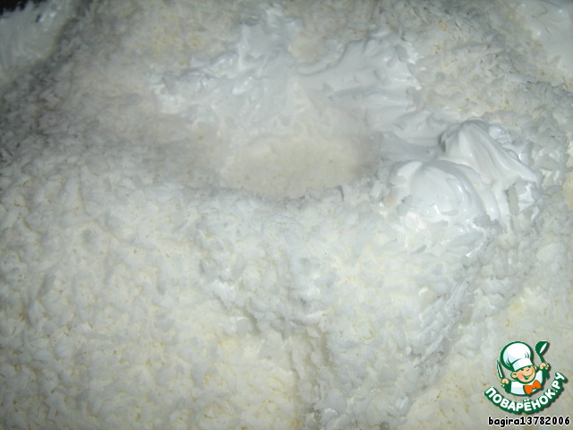 Затем добавим ванилин, кокосовую стружку, и аккуратно перемешаем.