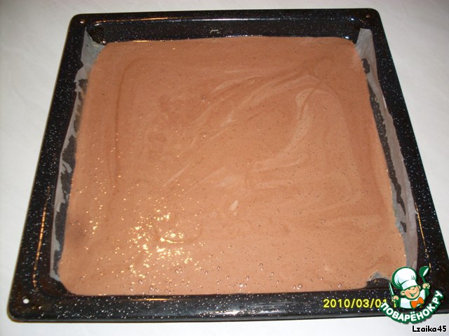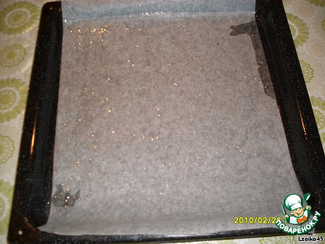 • Выливаем тесто равномерным слоем на противень и ставим в духовку, разогретую до 170* на 12-15 минут. Готовность проверяем зубочисткой...