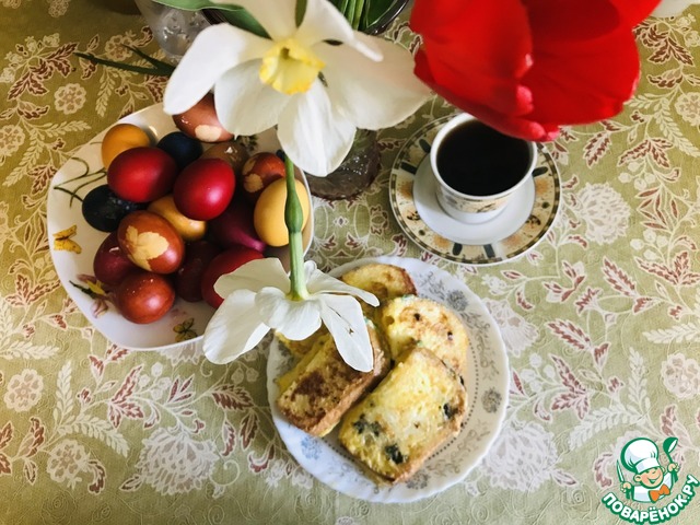 Кулич нарезать удобными вам кусочками и обмакнуть в яичной смеси.