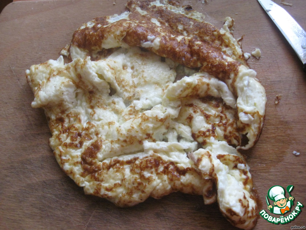 Приготовить омлет: 2 яйца взбить с молоком и посолить, поджарить на растительном масле, остудить и разрезать на полоски, затем свернуть каждую полоску в рулетик. Берем в ладонь немного фарша, делаем лепешку и заворачиваем в неё один рулетик омлета, обжариваем на растительном масле.