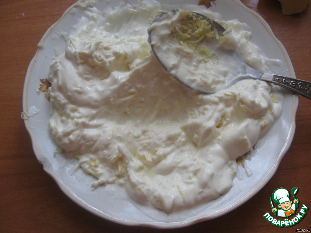 В это время готовим соус: смешиваем сметану, чеснок (пропускаем через пресс) и тертый на мелкой терке сыр, все перемешиваем. Когда зразы уже готовы, поливаем их соусом, накрываем крышкой и готовим еще 5 минут.