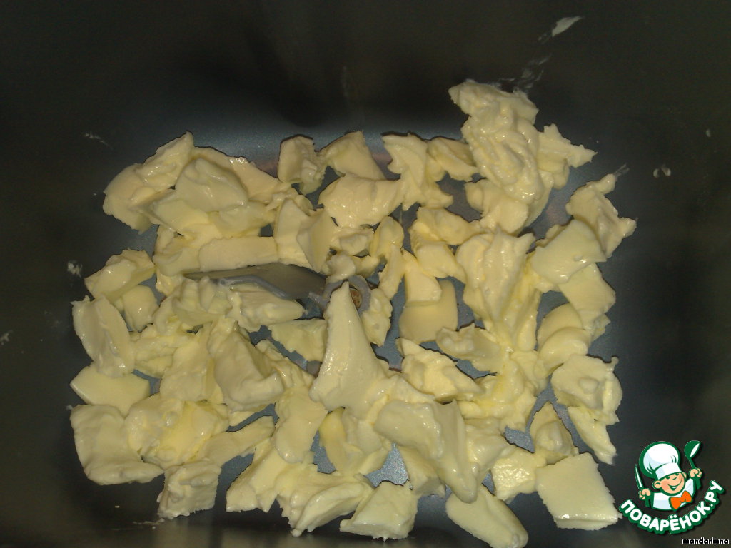 Сливочное масло комнатной температуры режем небольшими кусочками и выкладываем в емкость для ХП.