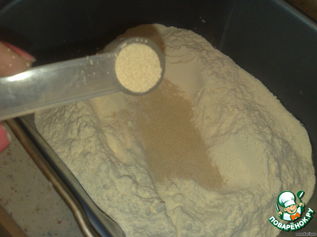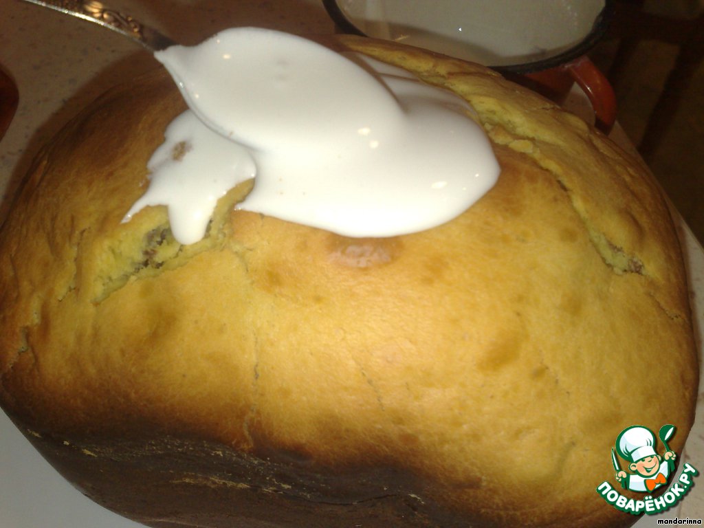 Сверху на муку (чтоб не соприкасались с жидкостью) всыпаем дрожжи. Устанавливаем программу "Сдобный пирог", общее время 3 ч. 22 мин., время выпекания - 55 мин. Кстати, рецепт для кулича весом 1 кг.