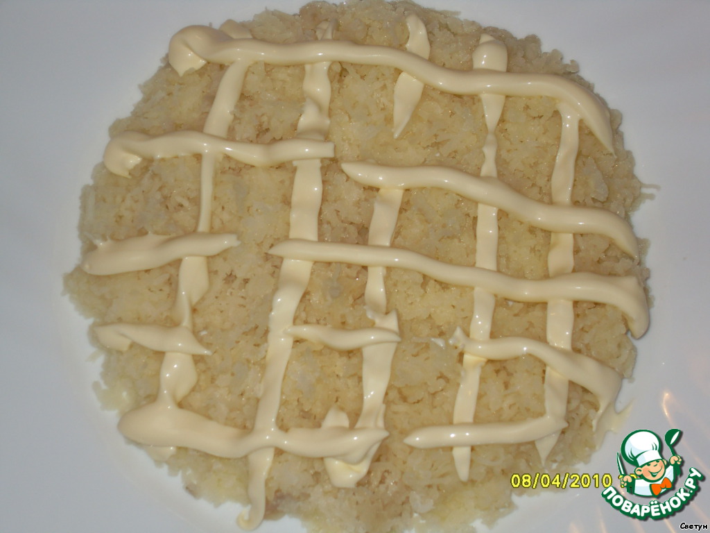 Почистить и натереть на мелкой терке картофель. Сделать сеточку из майонеза.