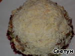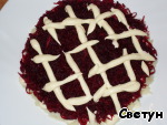 Почистить свеклу, натереть на мелкой терке, сделать сеточку из майонеза.