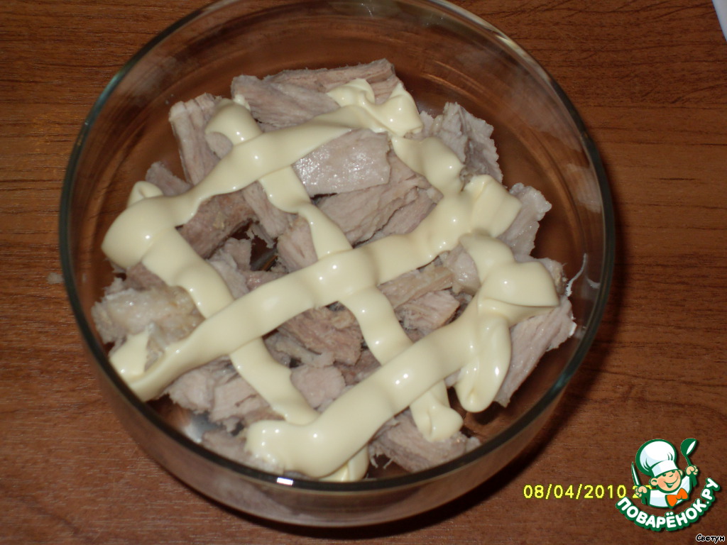 Нарезать отварное мясо кубиками и уложить первым слоем. Сделать сеточку из майонеза.