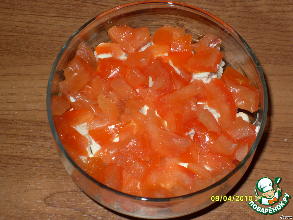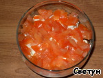 У помидора удалить сердцевину (чтобы не было воды в салате), нарезать кубиками, уложить на мясо.