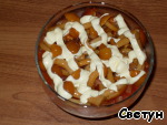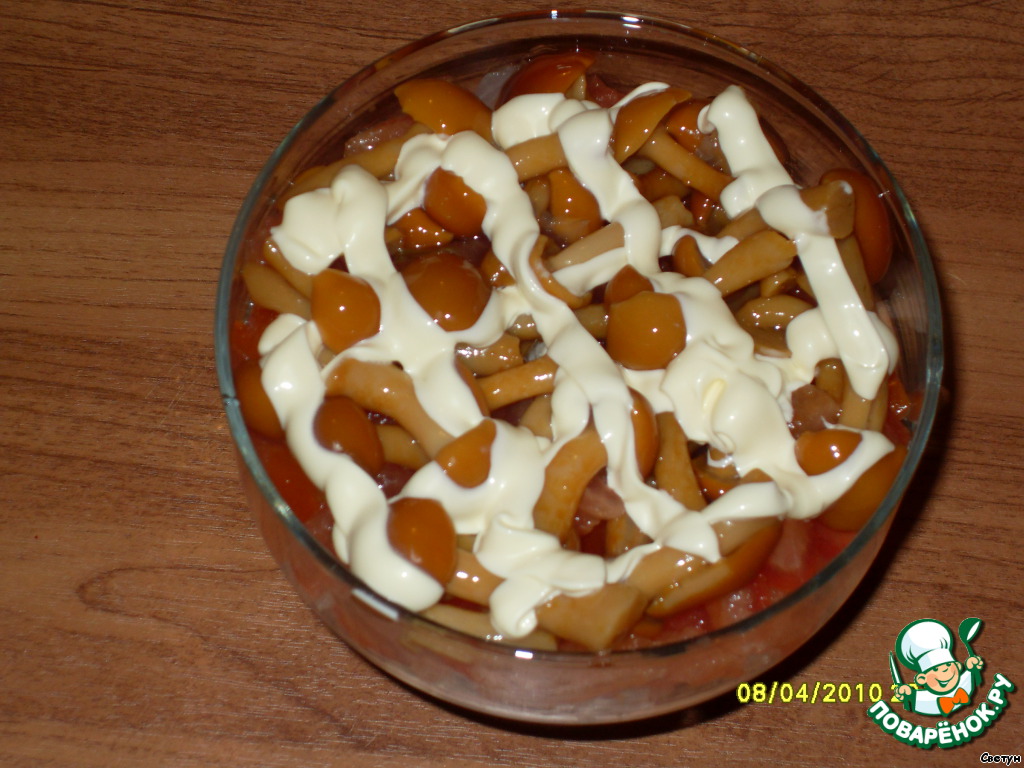 Положить маринованные грибы, сделать сеточку из майонеза.