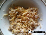 Из отварного окорочка достать косточки, мясо мелко нарезать.