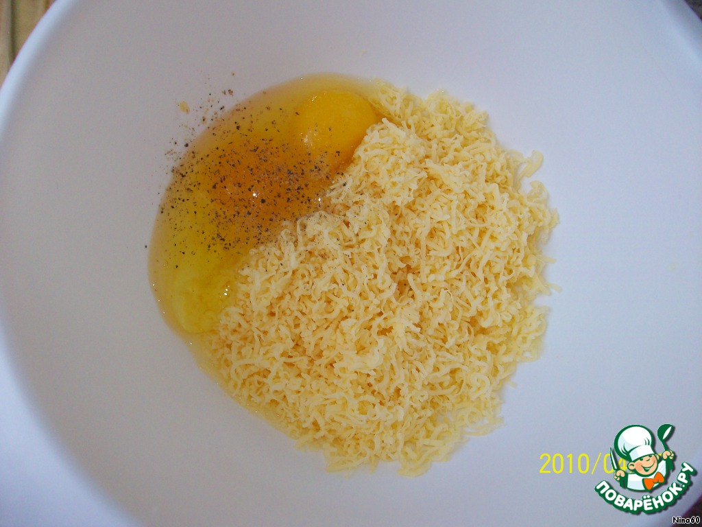 Натереть сыр на мелкой тёрке, добавить яйца, немного поперчить.
