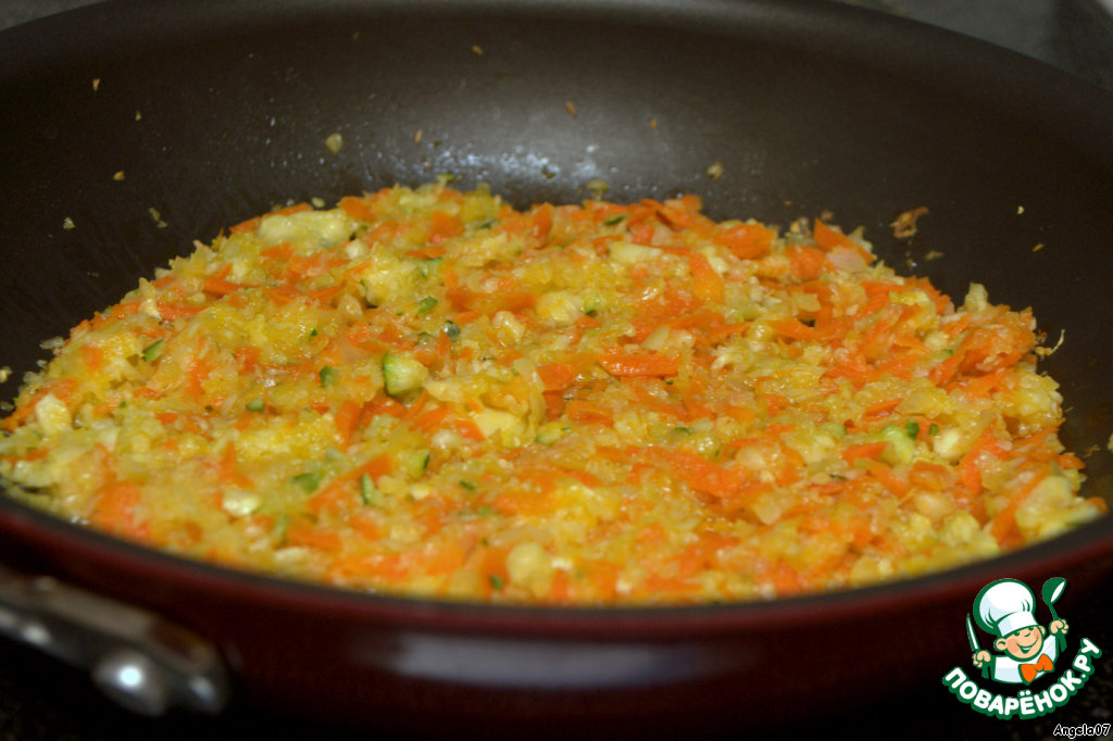 мелко нарезанный лук, морковь и вынутую мякоть цуккини обжарить слегка в небольшом количестве растительного масла