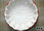 Слоеное тесто раскатать, поместить в форму (у меня была силиконовая, перед выпечкой сбрызнуть холодной водой), проколоть вилкой в нескольких местах, чтобы тесто не вздулось, а выпекалось равномерно.