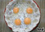 Затем разбить на смесь 4 яйца так, чтобы желток не растекся, поперчить и посыпать специями по желанию.