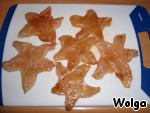 Куриное филе обсушить салфеткой и с помощью вырезанного из плотной бумаги трафарета или просто на глаз вырезать из него звездочки, сколько получится, штук 6.
