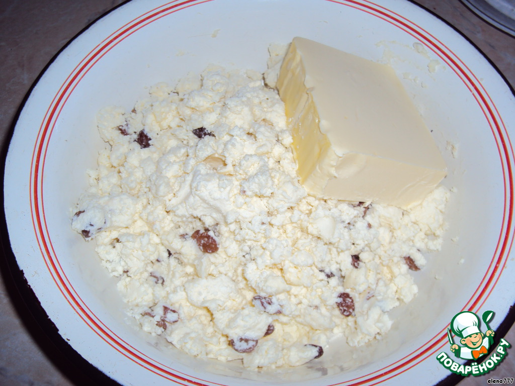 - Творожная масса (с изюмом, можно с курагой) — 600 г