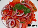 Лук нарезать кольцами, посолить и оставить на 5 минут постоять. Потом отжать, добавить к помидорам.