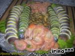 Выложить все на тарелочку, украсив лимоном, лаймом, листьями салата.