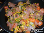 Поместить в сковороду с разогретым маслом. Поджарить немного, посолить и залить стаканом воды. Тушить под крышкой 15 минут.