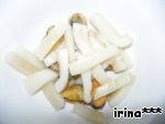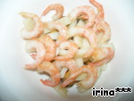 Креветки почистить. Мидии и креветки использовать целыми, кальмары нарезать полукольцами.