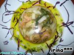 Желатин развести в процеженном бульоне от морепродуктов по рецепту, указанному на упаковке. Залить морепродукты желе. -