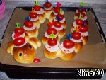 Положить на булочки кружочки колбасы, сверху маленькие помидорки и закрепить шпажками. Дети будут очень довольны.