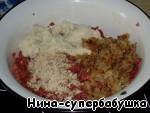 Добавить измельченный миндаль, щепотку сахара, соль, 1 взбитое яйцо и сок лимона. Все тщательно перемешать.