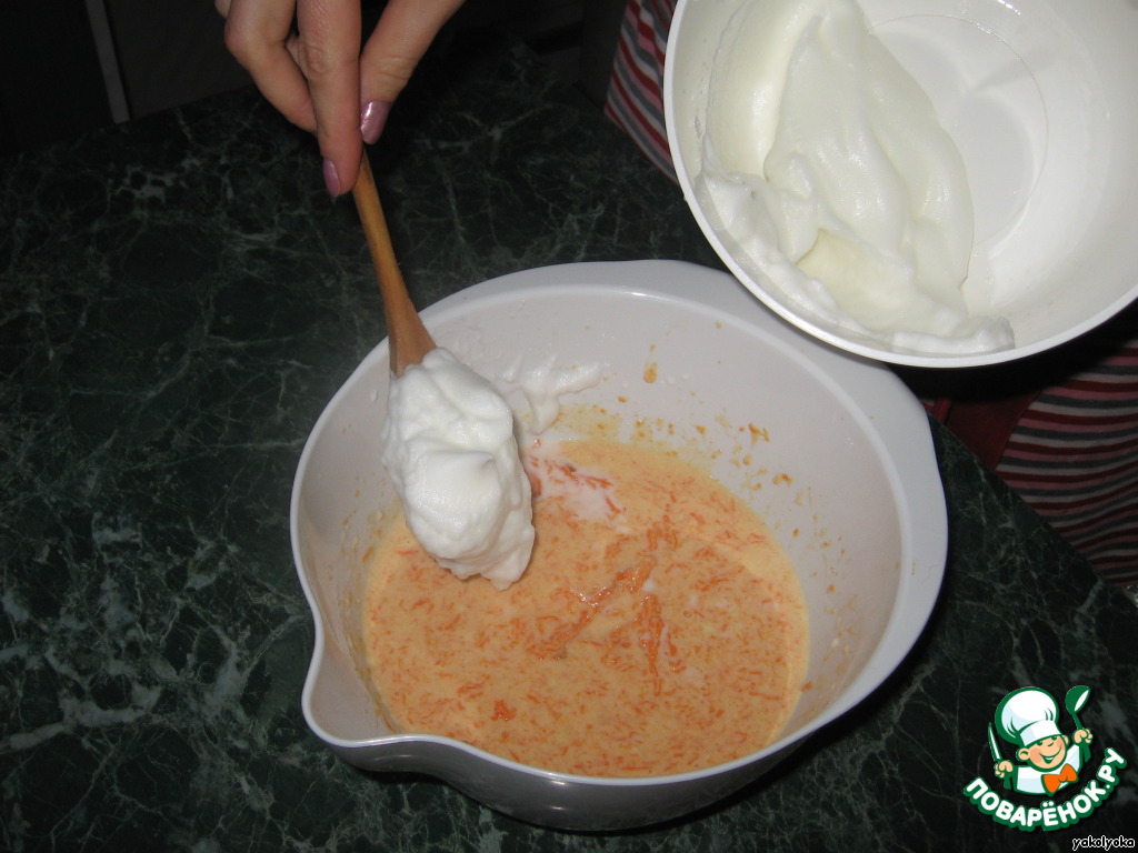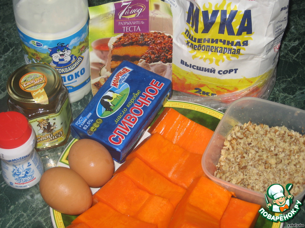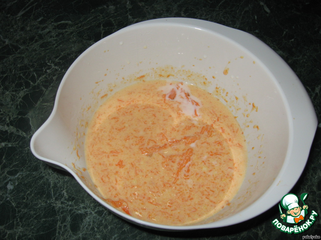 Миксером смешать муку с разрыхлителем, желтки, молоко, мякоть тыквы, 2 ст.л. мёда. Оставить смесь на 20 мин. -