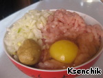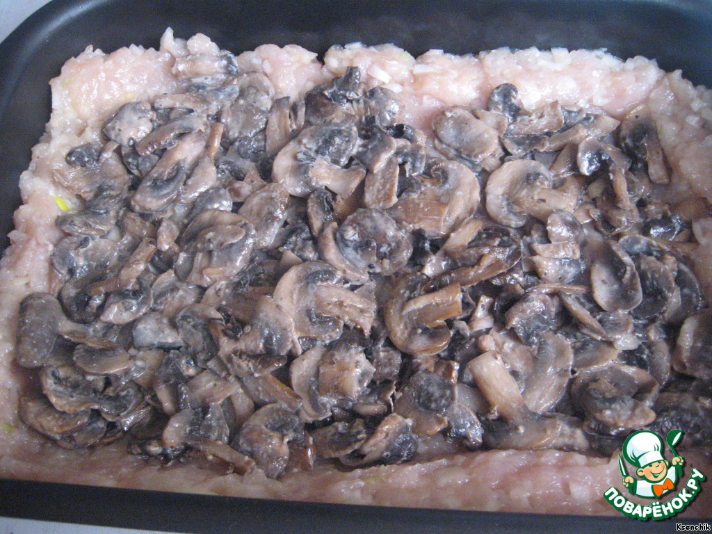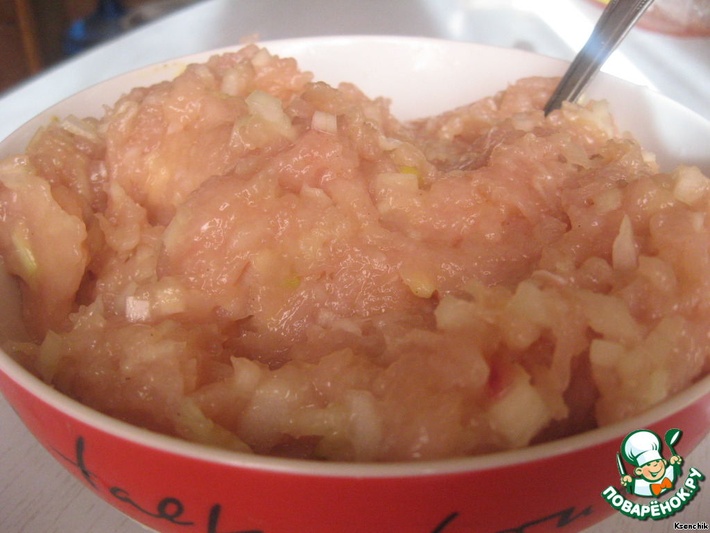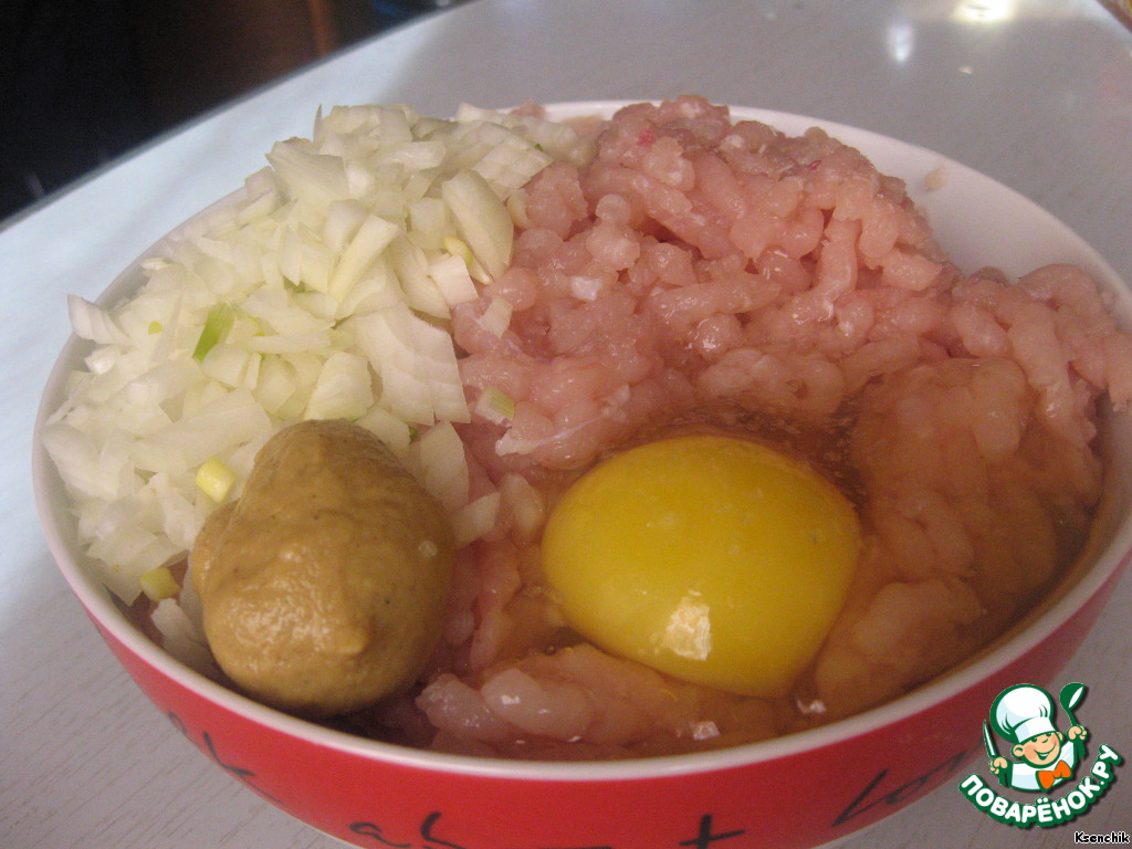 Перекручиваем филе на мясорубке (можно взять уже готовый фарш), лук мелко режем, добавляем сырое яйцо, горчицу и немного солим.