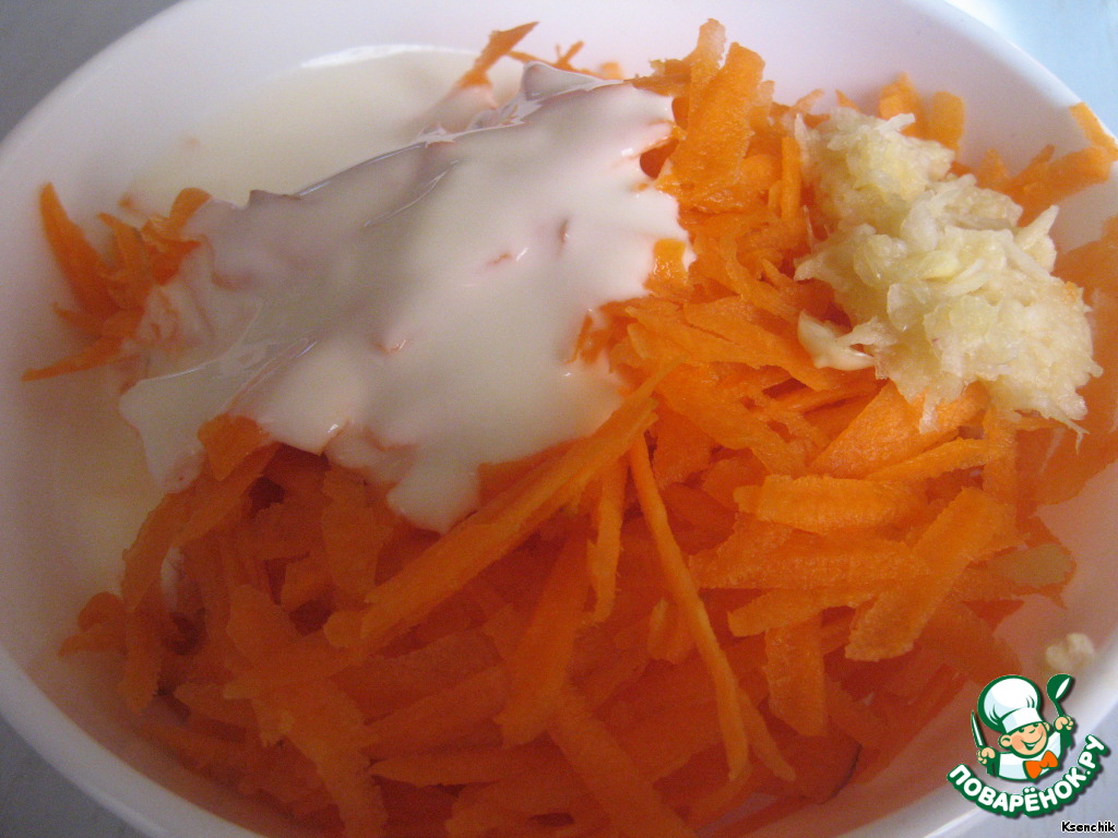 Делаем шубку из моркови с чесноком и сметанкой. И ставим в разогретую до 180*С духовку на 45 минут.