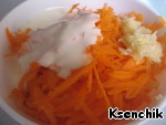 Пока грибы тушатся, морковь трем на крупной терке, чеснок на мелкой, добавляем сметану.