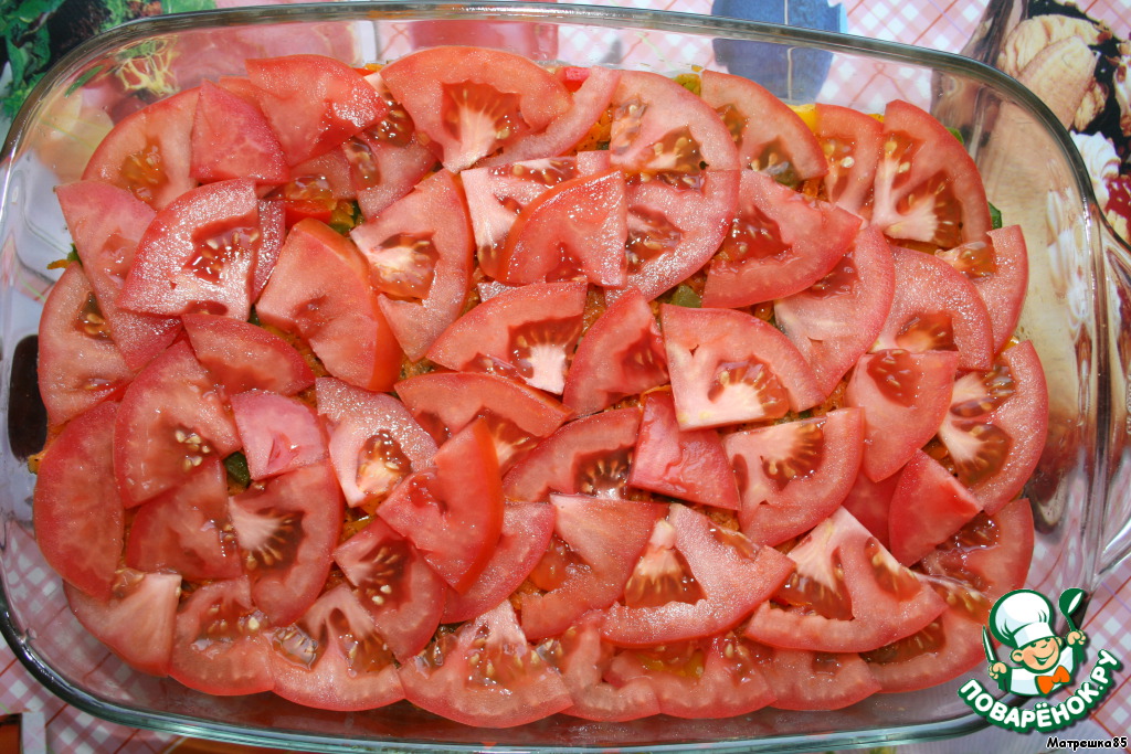 5-й слой: порезанные ломтиками помидоры. После этого убираем наше блюдо в разогретую до 180 гр. духовку на 25 мин. |