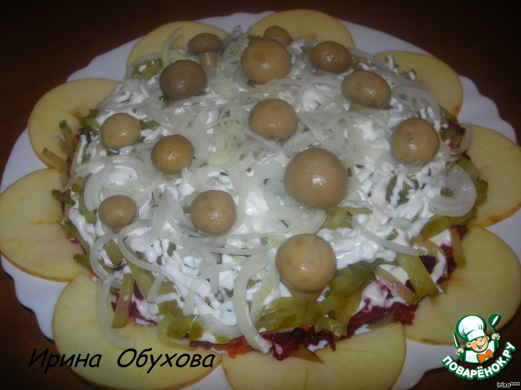 • На верхний слой положить несколько небольших соленых грибов, вокруг грибов уложить свежие яблоки, нарезанные кружочками (без середок).