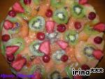 Желатин замочить. Когда желе начнет сгущаться, залить им торт. Пока желе не совсем застыло, украсить фруктами и поставить до полного застывания желе в холодильник.