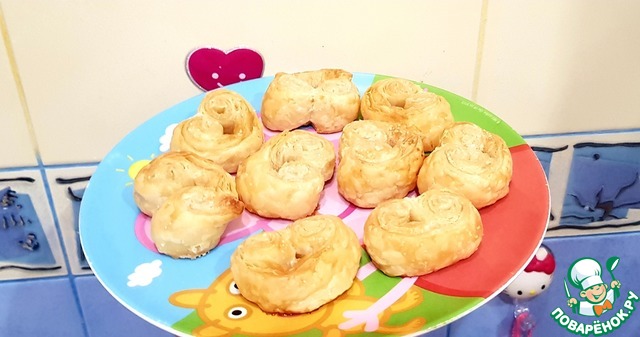 5. каждую полоску скатываем в рулетик, ножом надрезаем посередине и раскрываем печенье, как сердечко