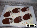 Белый шоколад распустить на водяной бане, обмакнуть кончик печенья в шоколад,положить ореховые палочки - коготки (продаются готовые, нарезанные).