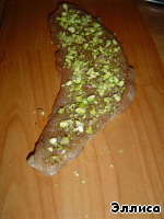 Пока мясо пропитывается, очищаем фисташки и измельчаем, а затем посыпаем ими мясо. |