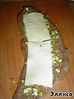 Пластинки сыра делим на две части и укладываем на фисташки. |