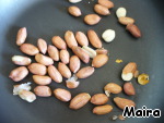 Арахис обжарить на раскаленной сковородке без масла 2-3 минуты. Очистить от шкурки, разделить на половинки.