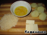 Картофель нарезаем на пластинки - у меня получилось по 4 кусочка с каждой картофелины. Пластиночки сыра (у меня был плавленый) должны хотя бы примерно подходить по размеру к нарезанному картофелю. Яйцо слегка взбить и немного посолить.