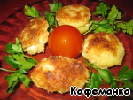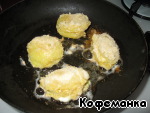 Теперь формируем "сандвичи". На кусочек картошки кладем пластиночку сыра и сверху накрываем картошечкой. Теперь обмакиваем в яйце, обваливаем в сухарях и... на сковородочку! Кто-то говорил, что лучше обваливать в натертом на терке слегка черством хлебе. Но такого хлеба у меня не оказалось...