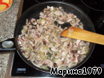 Лук и шампиньоны мелко нарезать, обжарить на растительном масле минут 10. Посолить по вкусу, снять с огня и немного остудить.