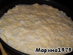 Достать из духовки форму, снять фольгу и выложить на пирог сырно-белковую массу.