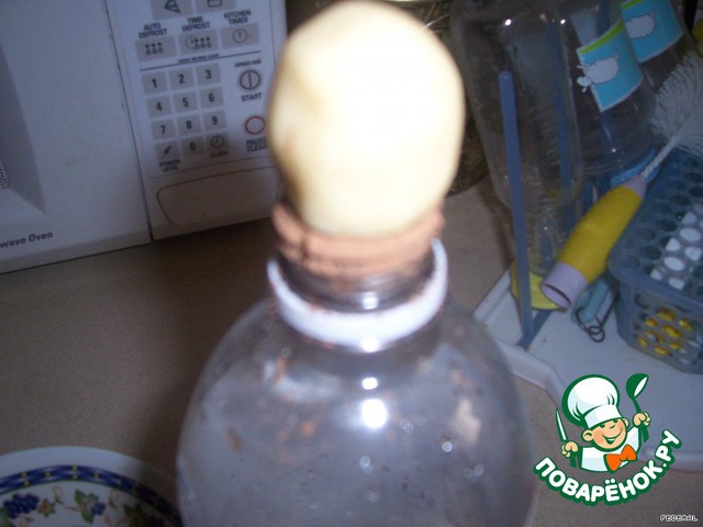 Потом этот шарик кладём на горлышко бутылки и прижимаем, чтоб половина теста вдавилась в бутылку, так получается ножка и шапочка.