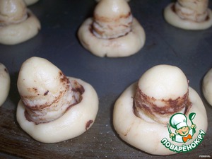 Готовые печенья складываем шапочкой вниз на противень, застеленный фольгой или бумагой для выпечки, выпекать про 180 гр. 10-15 минут.