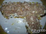Выкладывать салат слоями, в форме пистолета, каждый слой поливая майонезом: