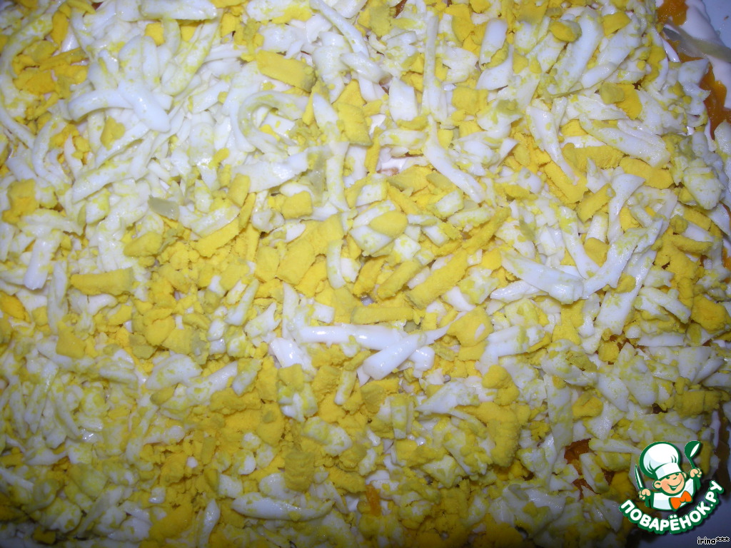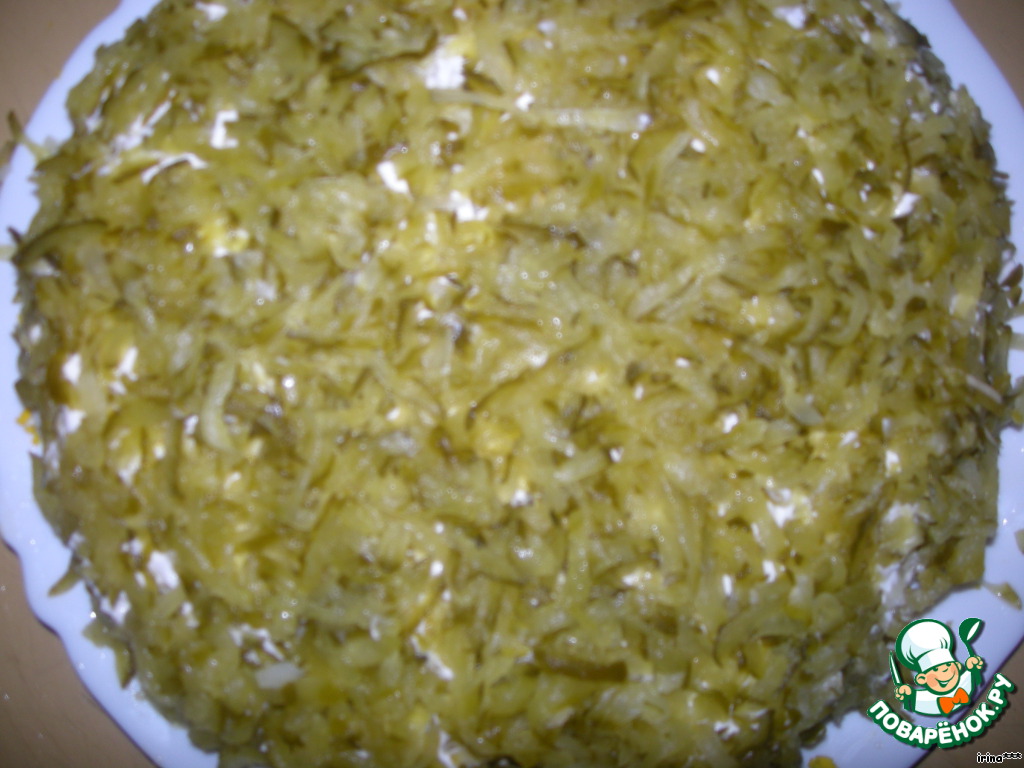 Яйца, морковь, картофель, солeные огурцы натереть по отдельности на крупной терке.