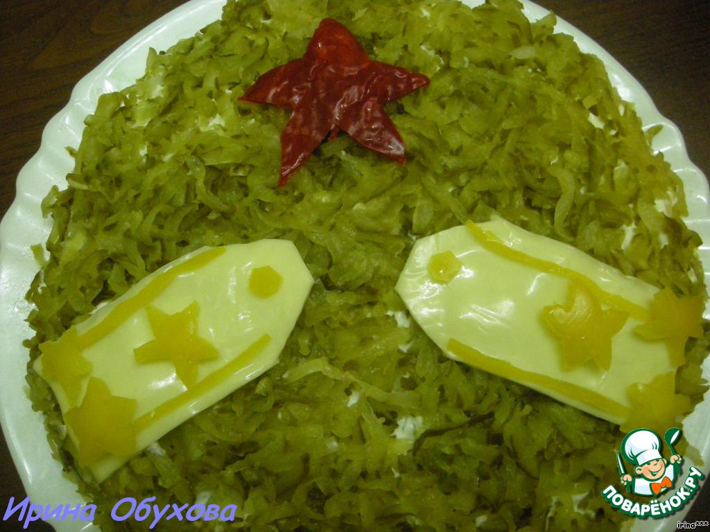 Для украшения разрезать пластинку сыра на две части - это "погоны". Кладем их на салат. Из перца вырезать звезды, полоски и пуговицы. Оформляем «погоны».